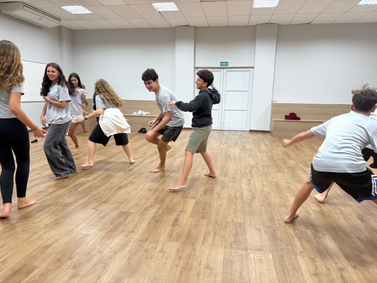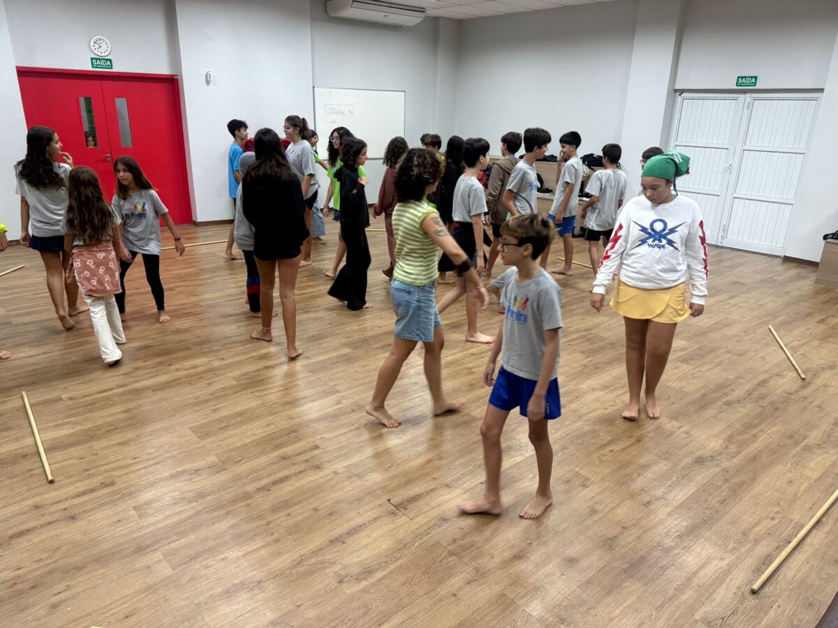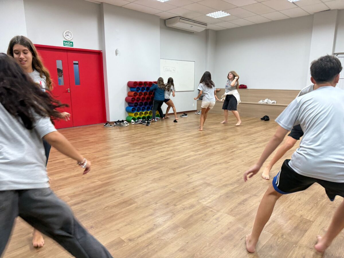 Em uma dinâmica em roda, palavras como jogar, cair, levantar, cooperar e desistir foram traduzidas em gestos, explorando ritmo, qualidade de movimento e presença. Ao som de É só isso, de Caetano Veloso e José Miguel Wisnik, os alunos organizaram coletivamente uma pequena composição coreográfica, refletindo sobre questões como: O corpo fala? Gesto é dança?