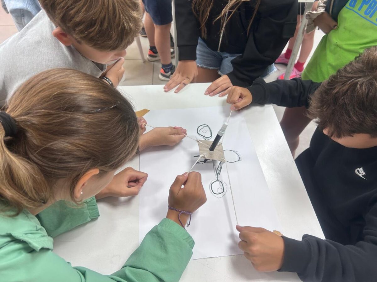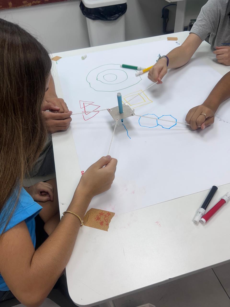 Para provocar esses e outros questionamentos e experimentar essas relações na prática, os estudantes participaram de uma dinâmica de desenho coletivo utilizando uma “ferramenta” que permite que várias pessoas controlem ao mesmo tempo uma única caneta por meio de barbantes.