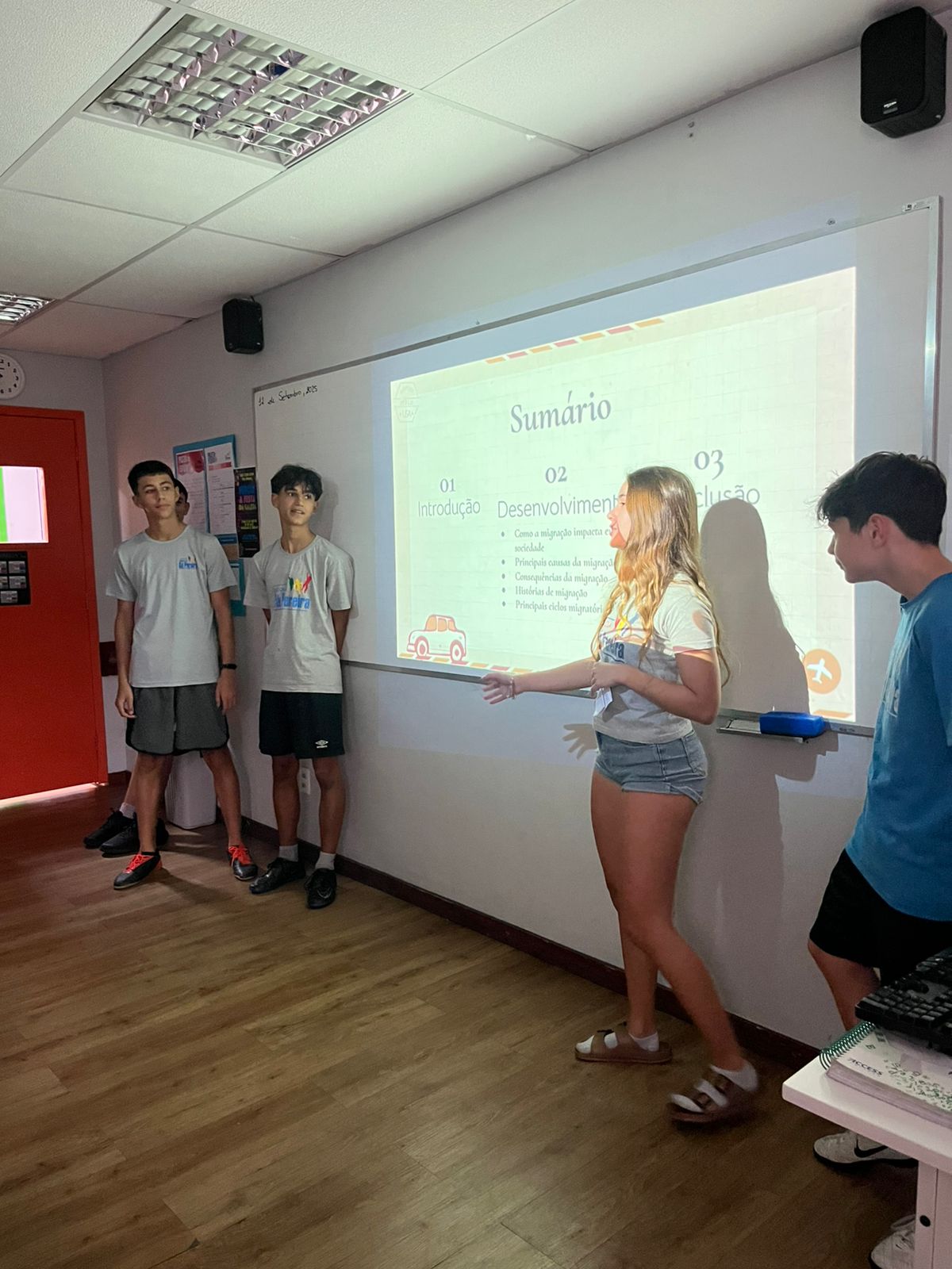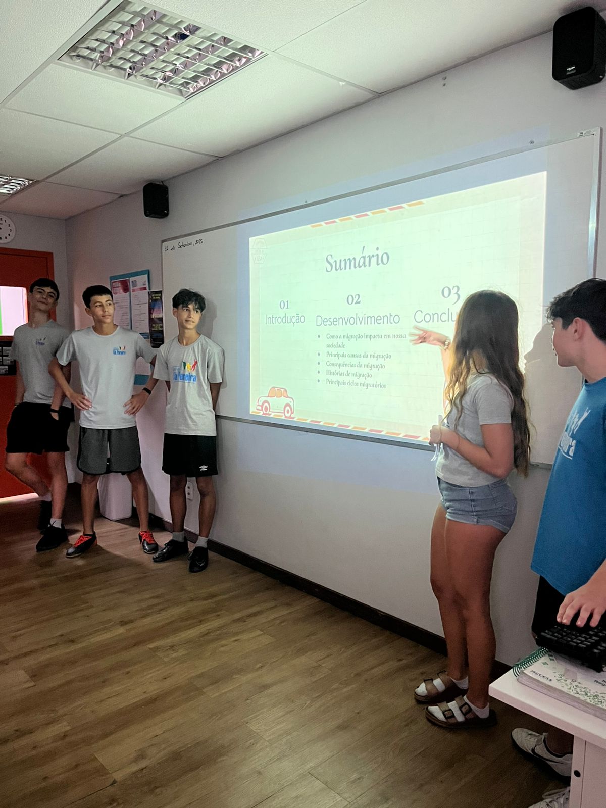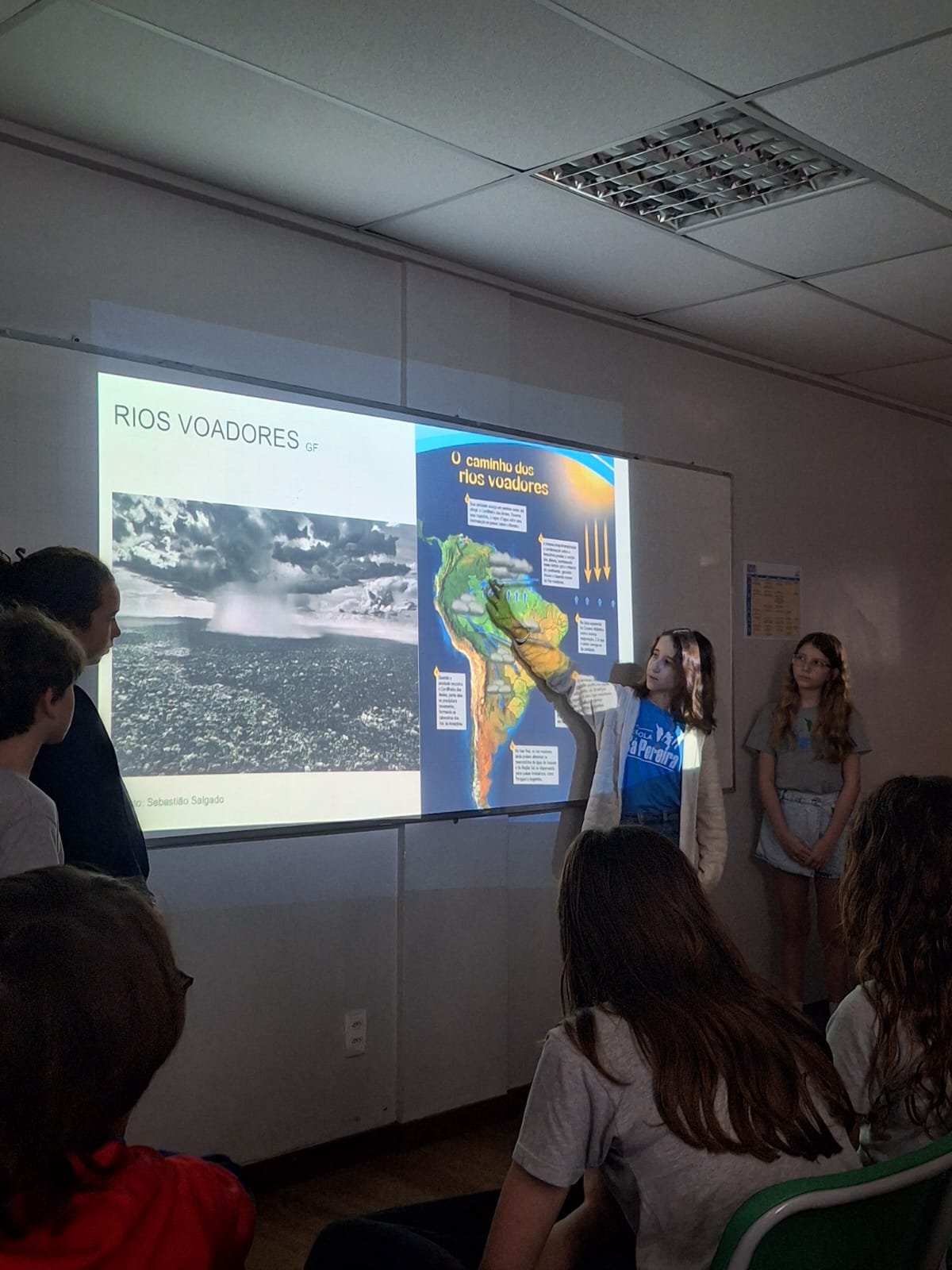 Cada grupo compartilhou suas descobertas e reflexões para a turma e para convidados, mobilizando não apenas os conteúdos estudados, mas também estratégias de comunicação. Os temas foram variados, desde registros visuais da ditadura militar até estudos sobre globalização, cultura pop, mudanças climáticas, deslocamentos humanos e a relação entre rios e urbanização.