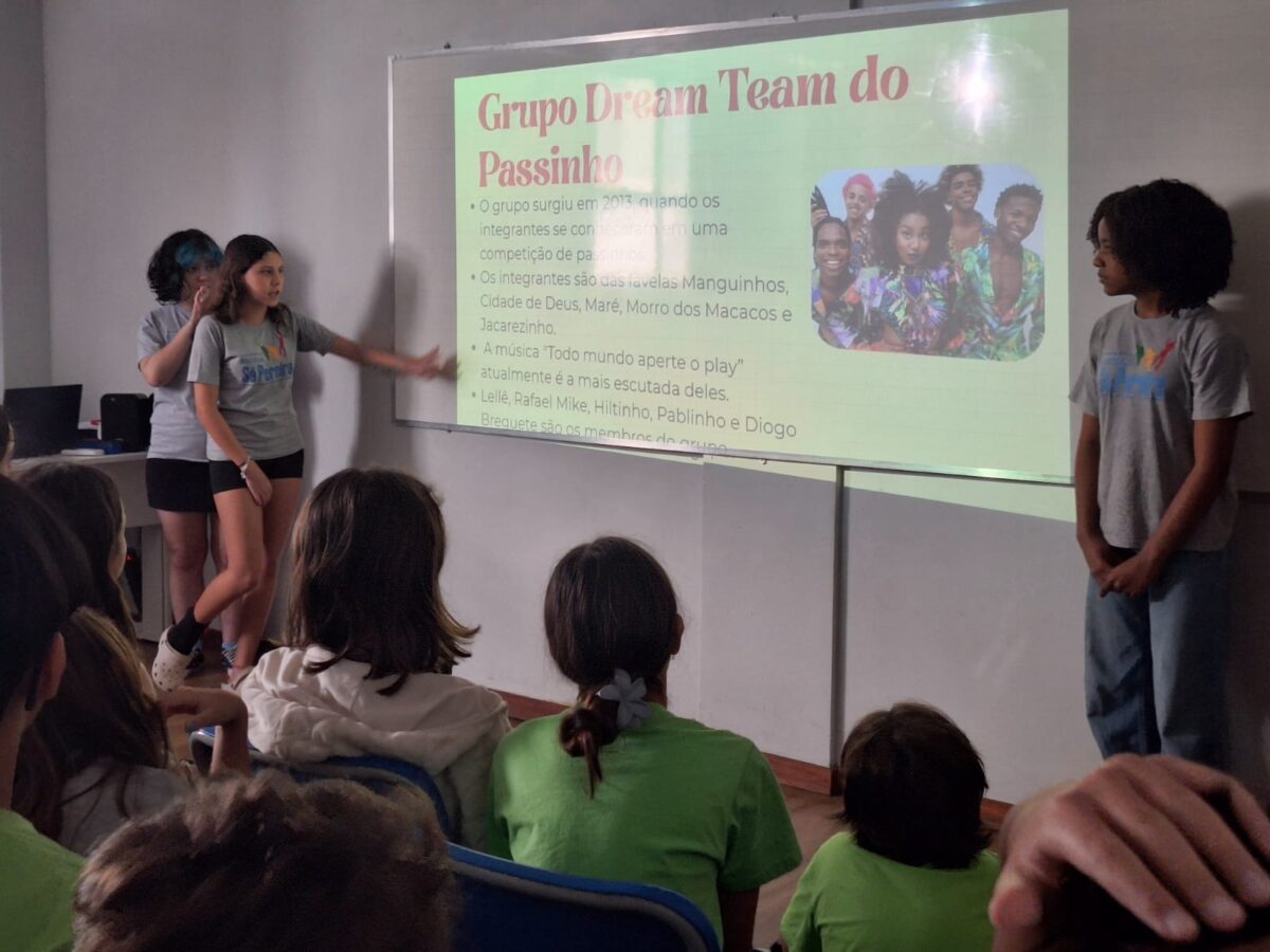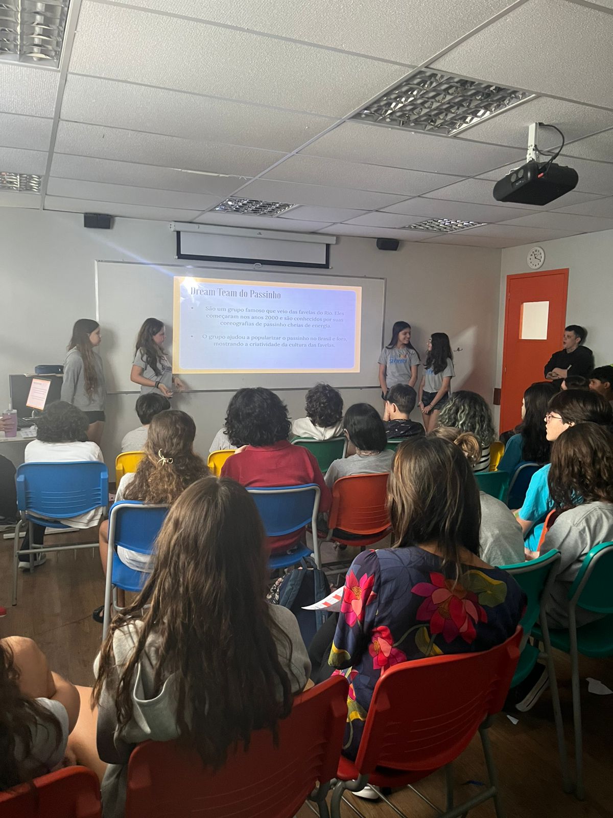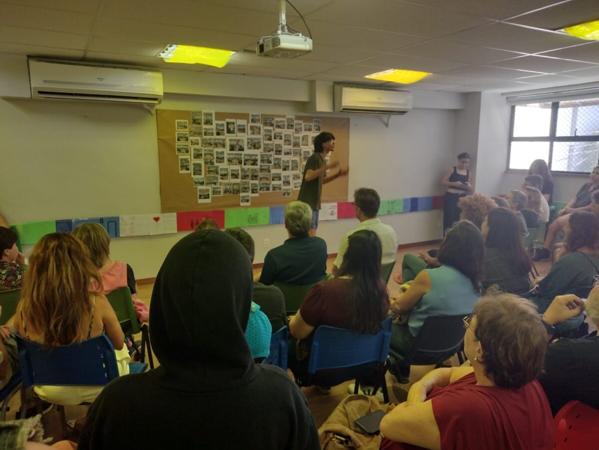Cada grupo compartilhou suas descobertas e reflexões para a turma e para convidados, mobilizando não apenas os conteúdos estudados, mas também estratégias de comunicação. Os temas foram variados, desde registros visuais da ditadura militar até estudos sobre globalização, cultura pop, mudanças climáticas, deslocamentos humanos e a relação entre rios e urbanização.