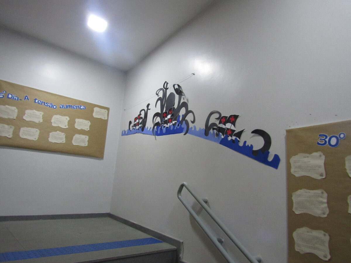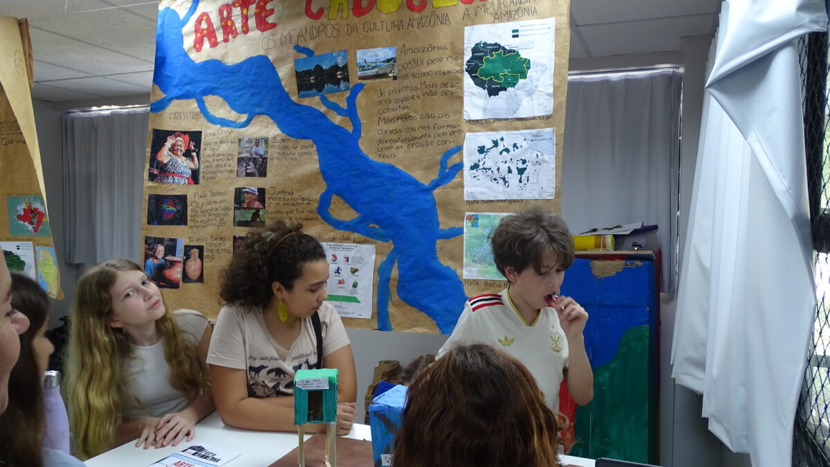 A interdisciplinaridade também esteve presente: nas escadas, as F6 apresentaram um Diário de Bordo em História, com relatos das viagens dos exploradores em busca de novos mundos; em Geografia, o Circuito das Artes convidou a percorrer as diferentes regiões do Brasil; em Ciências, as F8 trouxeram reflexões inspiradas no livro Sapiens: Uma breve história da humanidade.