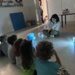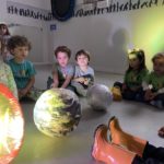 Para ilustrar a posição da Terra no espaço, fizemos uma experiência com luz, no salão. Com um refletor e duas bolas, representando o Sol, a Terra e a Lua, observamos onde a Terra se localiza, falamos sobre rotação e translação, e refletimos sobre a influência desses movimentos sobre nosso dia a dia.