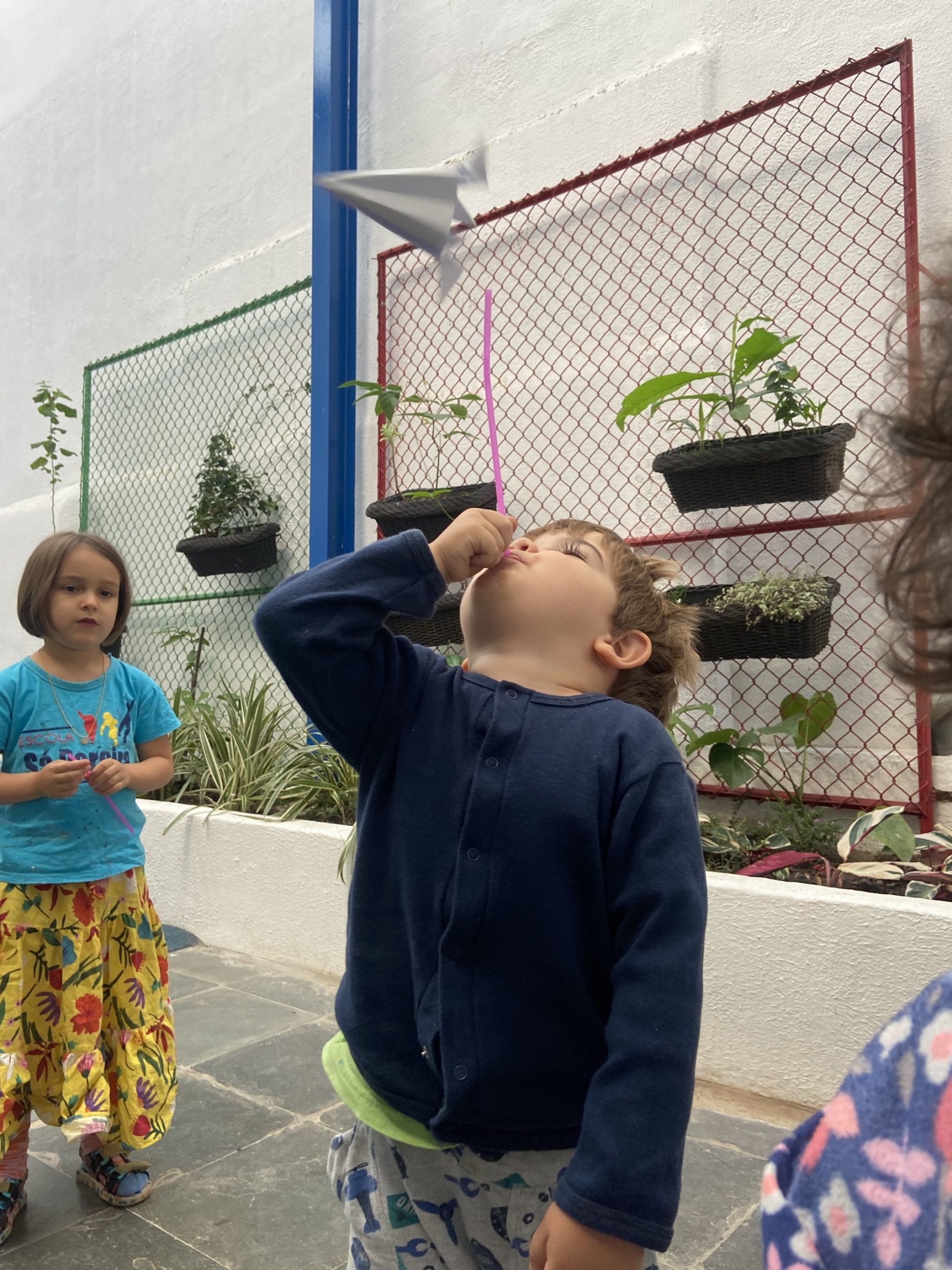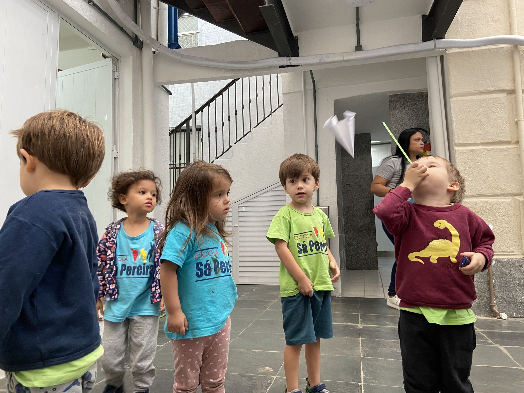 Para entender como funciona o foguete, sopramos um foguete de origâmi para cima; depois de muitas tentativas, conversamos sobre a força do ar e seguimos para outra experiência.