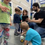 Mostrou fotos do processo de construção e os materiais utilizados. Com comandos dados do tablet, fez o robô girar, andar e acender luzes. Ele disse que tudo que tem botões de ação é um tipo de robô.