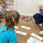 Fizemos uma lista e colocamos na nossa caixa, palavra por palavra: parede, chão, brinquedos, pintura, agenda, mochila, pula-pula…