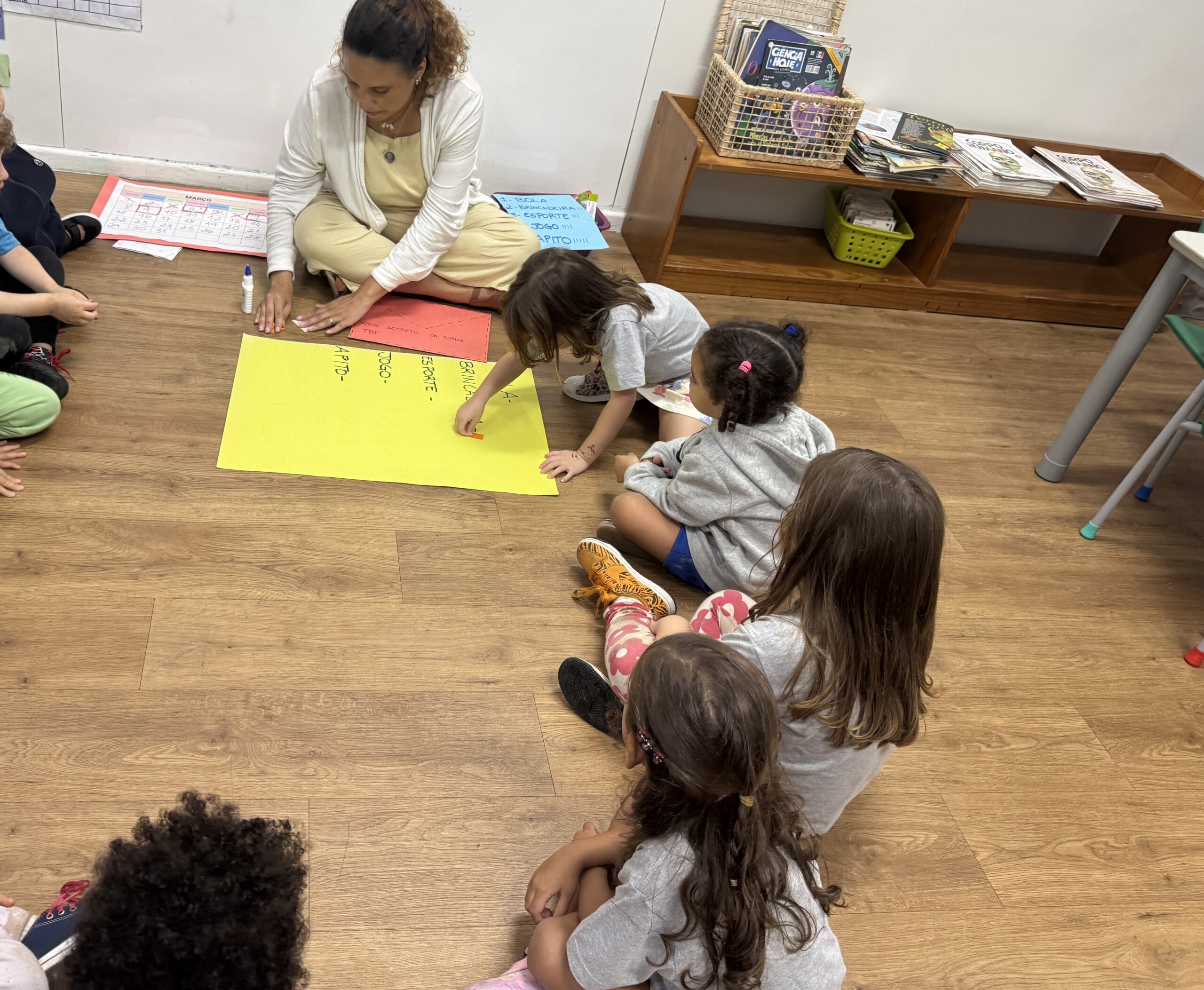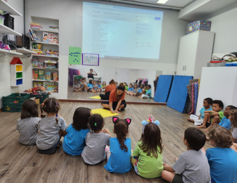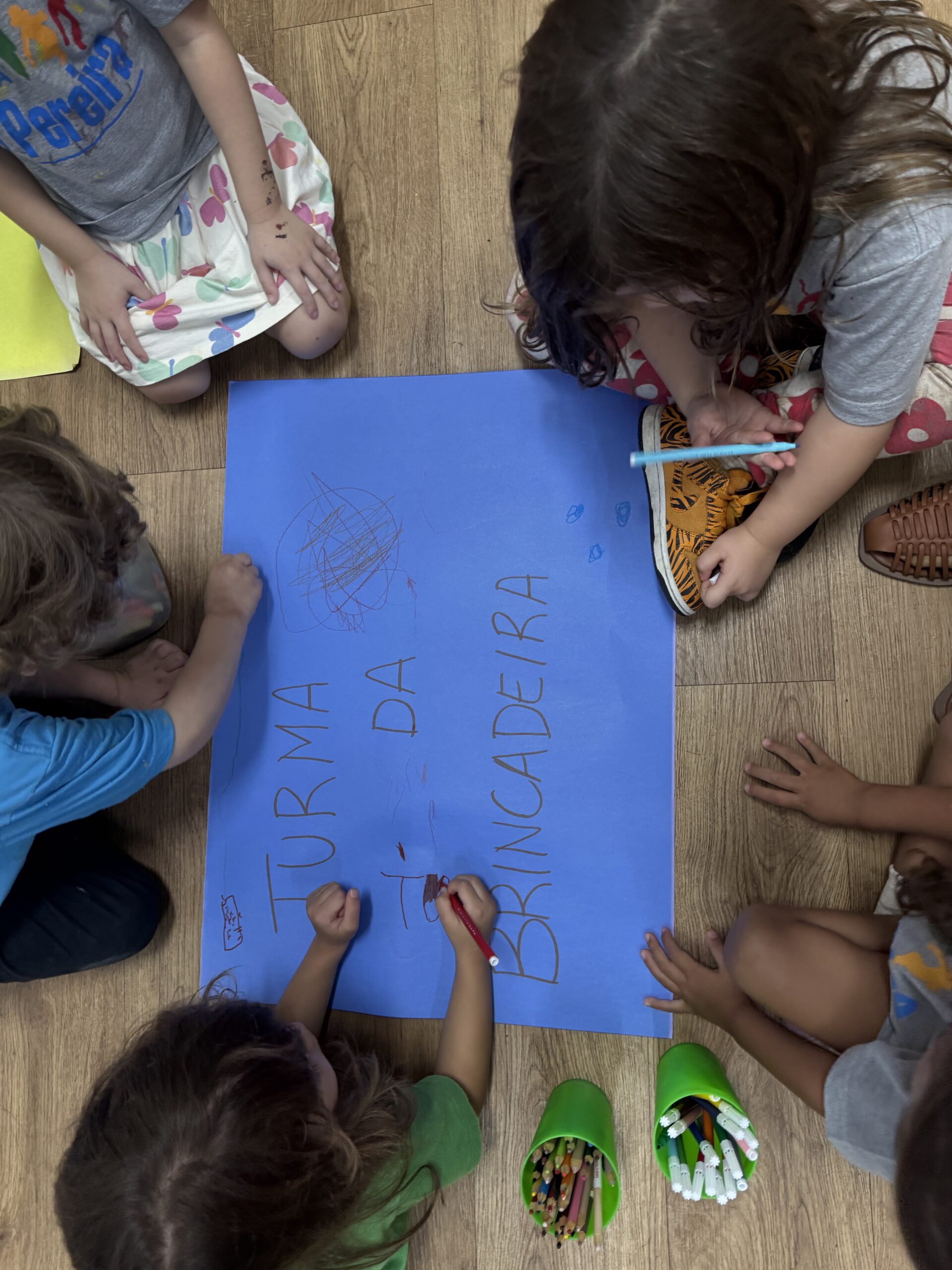 O momento também contou com um passeio animado pela escola para informar às outras turmas a decisão do grupo. Com cartaz em mãos e uma rima – “Eira eira eira, é a Turma da Brincadeira!” – o nome foi anunciado!