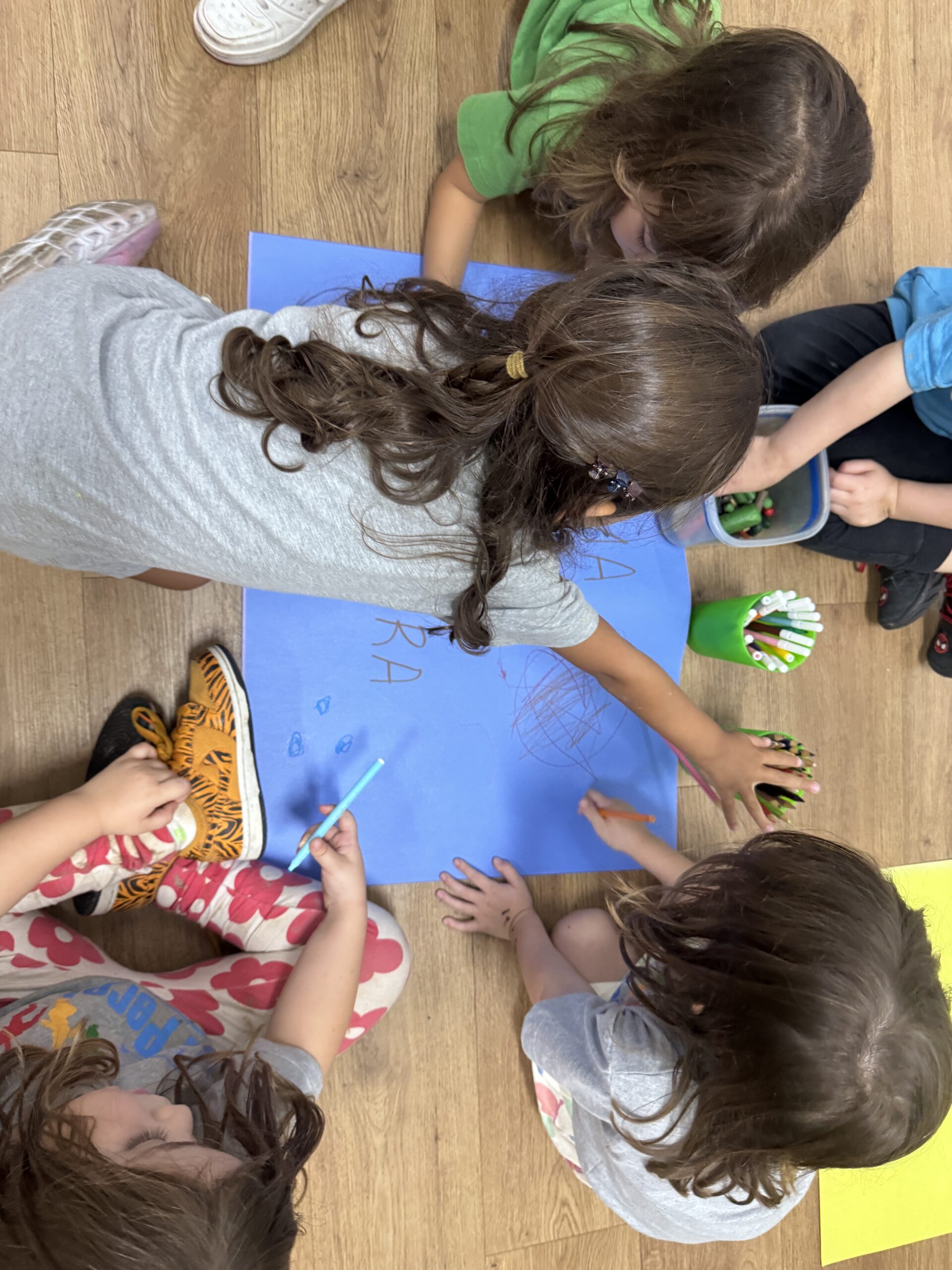 Enquanto as palavras ganhavam forma no papel, o grupo foi desvendando as propostas escondidas nas rimas. Foi lindo observar as crianças identificando brincadeiras que já conhecem e se encantando com as novas que surgiram nos versos. Logo, o que era escrita virou corpo, e terminamos o registro dançando, experimentando cada ritmo que a música sugeria e aumentando nossa lista de brincadeiras para o passeio!