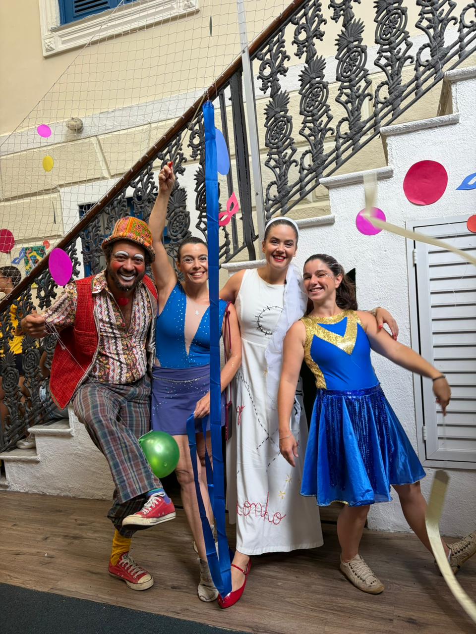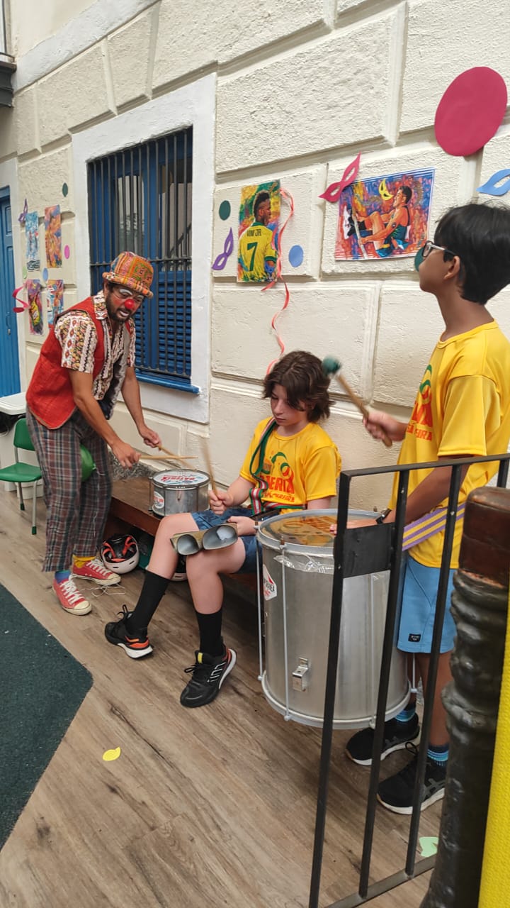 Mais do que uma celebração, o bloco é um disparador do nosso projeto de pesquisa. É ele que inaugura o tema do ano e coloca o corpo em ação como território de experiência, encontro e aprendizagem. Por isso, mais uma vez, realizamos o concurso de samba, convidando toda a comunidade escolar a compor, cantar e pensar junto. Entre os sambas inscritos, o escolhido foi “Um passo à frente”, de Carlos Fernando M. Silva e Moyses J. Cohen, tornando-se trilha, linguagem e pergunta.